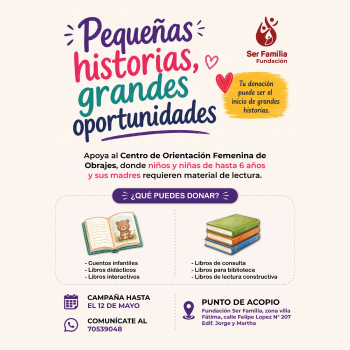 Desde la Fundación Ser Familia, te invitamos a sumarte a nuestra campaña de recolección de libros infantiles para apoyar al Centro de Orientación Femenina de Obrajes, donde necesitan material de lectura.